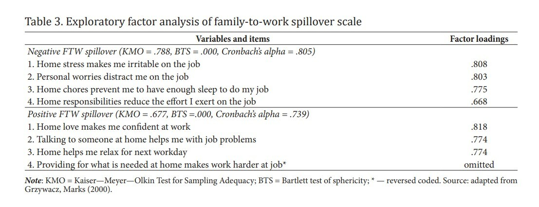 As a result of the EFA of family-to-work spillover, a two-factor structure was confirmed. As Table 3 shows, the first factor has the loadings of all items exceeding 0.4, and the value of Cronbach’s alpha is 0.805, therefore, all four items will be used to calculate the "negative FTW spillover" variable. In the second factor, one of the items has too low loading. Therefore, it was decided to exclude this item from the factor, because of which the value of Cronbach’s alpha increased to 0.739. Accordingly, the "positive FTW spillover" variable was calculated as the mean of these three items. The Cronbach’s alpha exceeds the suggested threshold of 0.7 (Tavakol, Dennick, 2011).