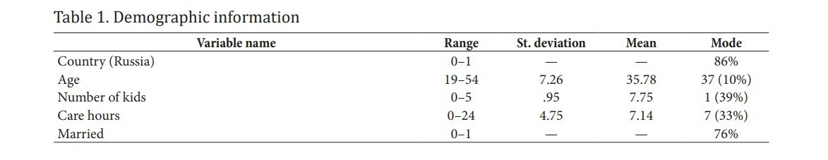 The main task for conducting research was to find a topic that was interesting to us and would have a potential to contribute to the niche that is a burning issue in today’s society. We sincerely believe that the topic we have been working on not only deserves to grow in popularity and discussion in the media but will also bring something new for women from CIS countries. It is worth noting that due to the importance of this agenda, namely the search for ways to enhance women’s subjective well-being, as well as constant conversations in the mass media about the problems faced by women due to the lack of balance between work and family in their lives, such studies have been conducted more and more (Aazami et al., 2015). The main study group of our study consisted of women. Women have become the primary target of these articles for many reasons: discrimination they face not only in society but also in the workplace in terms of salaries, career progression, and leadership positions. In turn, such a career advancement is also complicated by the fact that there is a stigma regarding which of the partners performs household duties. As a rule, women are expected to perform several duties after a hard-working day (Poduval, Poduval, 2009). Namely: washing, cooking, cleaning, classes with a child, caring for elderly relatives and so on. If all the responsibilities of this kind fall entirely on a woman, this may lead to emotional burnout and other mental issues (Maslach, Leiter, 2016). It becomes almost impossible for women to perform their work duties after such demanding work at home, which only strengthens the stereotypes about female employees and hinders their careers (Lazarus, Folkman, 1984). It is to reduce such stereotypes that we decided to study this topic in detail and devote this work to it.